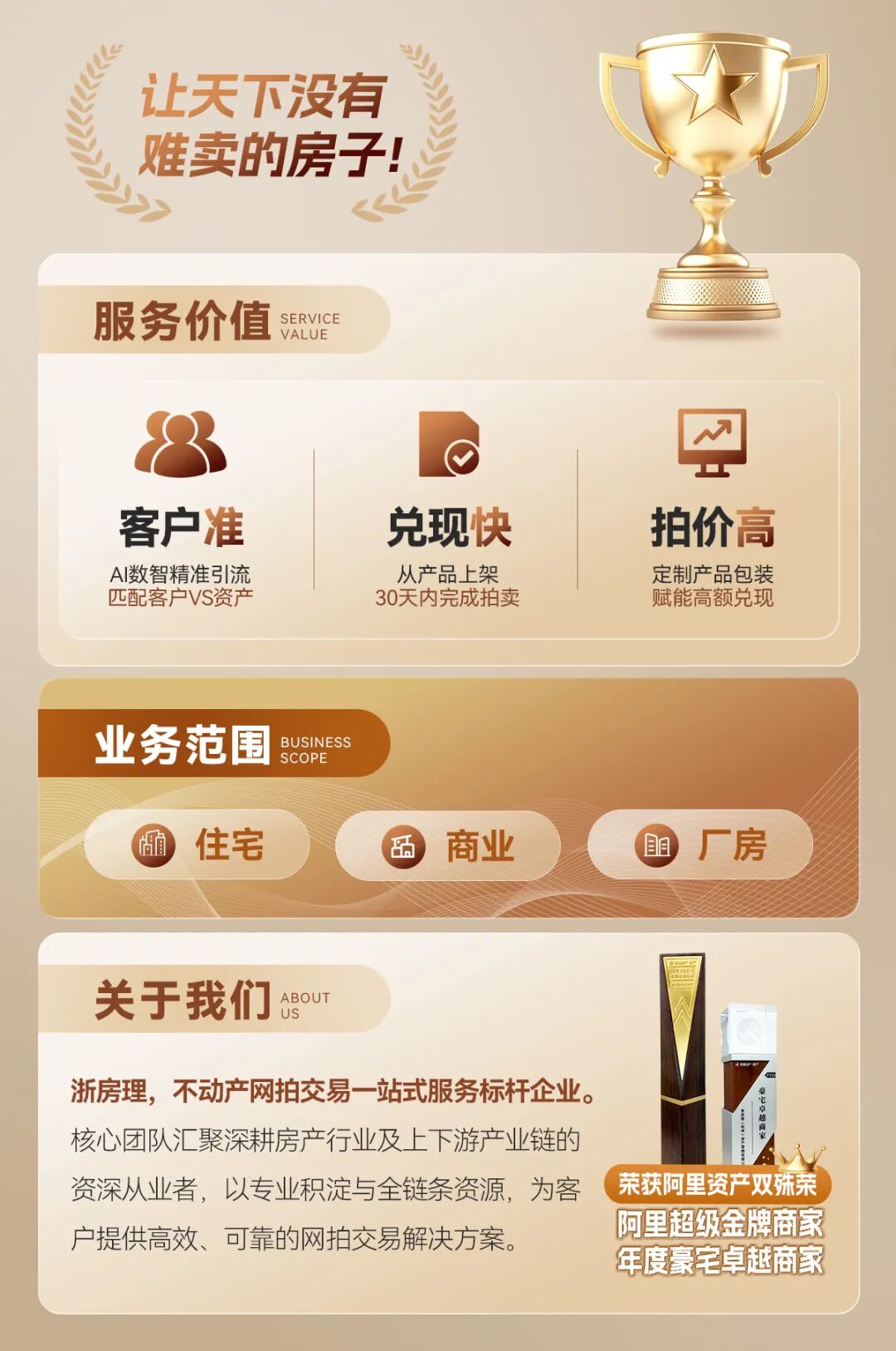 阿里资产房产是阿里集团旗下不动产数字化交易服务平台。浙房理(杭州)作为超级金牌服务商将继续深耕浙江市场,专注于房产线上营销、不良资产处置及豪宅交易服务。依托阿里生态与数字化技术,浙房理打造了“咨询+尽调+贷款+过户”的一站式服务体系,致力于解决客户在资产交易中的复杂难题。选择浙房理,让资产流转更简单,让置业安家更安心。