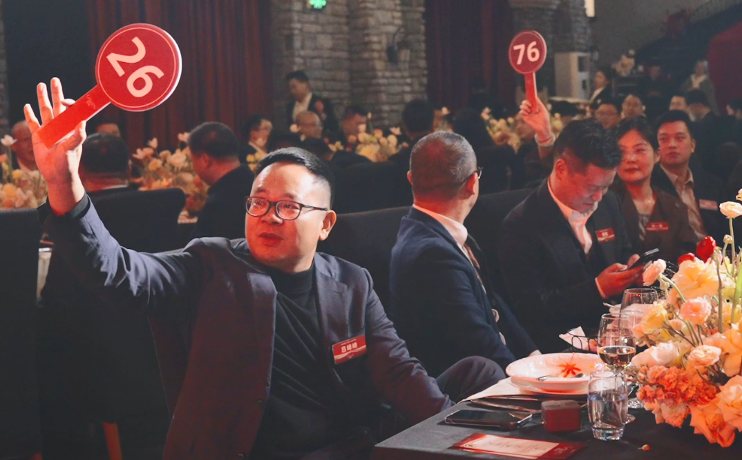 晚宴特设温情满满的公益拍卖环节,由国家注册拍卖师丁丁主持,现场爱心涌动。阿里商拍五星渠道服务商王总与浙房理(杭州)吕总积极参与竞拍。最终,王总成功竞得「三檀雅集」木质淘公仔收藏礼盒。